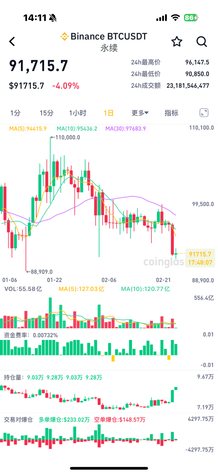 比特币价格经历了一次剧烈的闪崩。2月24日晚,比特币首次跌破95000美元关口,随后进一步下探。根据最新行情数据,比特币在短短一小时内从94000美元急速下挫至90880美元,24小时内跌幅扩大至近4%,远超市场预期。这一暴跌不仅刷新了自2月3日清算以来的最大单日跌幅,还引发了加密货币市场的连锁反应,全网28.4万人爆仓,约8.82亿美元资金“蒸发”,美股加密货币概念股同步下跌,市场恐慌情绪迅速蔓延。